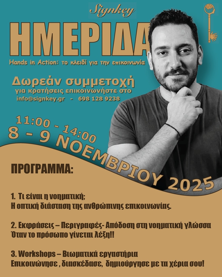 Η σχολή Ελληνικής Νοηματικής Γλώσσας Signkey διοργανώνει στις 8-9 Νοεμβρίου στο χώρο της σχολής, ημερίδα με θέμα τη νοηματική γλώσσα. Βιωματικά εργαστήρια και δράσεις συμπερίληψης θα λάβουν χώρα και τις δύο μέρες.